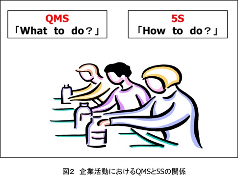 QMSが業務の枠組みを示し、5Sがその実施手順を示しています。(図2参照)