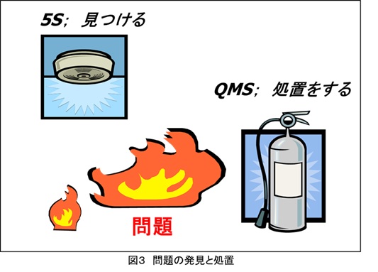 5Sは異常や問題を知らせるツールであり、QMSはその解決を図るツールとして、改善活動に寄与します(図3参照)。