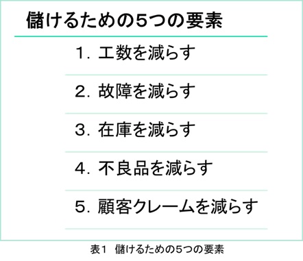 ここまで述べたように、企業活動の中で、すでにQMSと5Sは活用されています。本章では、企業活動において、効果的(より高く)に、効率的(より少ない資源で)に利益を挙げる、つまり儲けるための5つの要素(表1参照)について、QMSと5Sの活用法を考えてみたいと思います。なお、5Sに係わる内容については、第1章を担当した古谷氏の著書(参考文献2参照)を参考にしました。